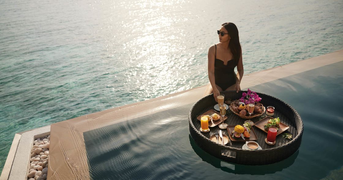 Wakeup to this unique dining experience. You’ll find a beautifully curated breakfast selection floating on a tray in your own private pool. You can choose the menu or let our chefs pick for you, complemented with two glasses of Champagne.